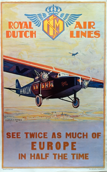 Luchtvaart: 50 jaar KLM Royal Dutch Airlines- 1969 Herdruk van het affiche uit 1928 ‘See twice as much of Europe in half the time’. Ontwerp: Charles C. Dickson